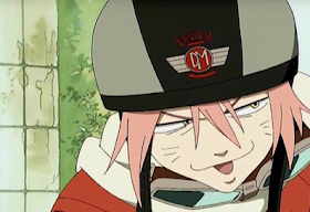 The two are walking home one day when Naota is run over by a crazy pink-haired girl riding a Vespa scooter. She stops to hit him in the head with her electric guitar. Miraculously he survives, but now has a big oddly-shaped lump sticking out of his head. The crazy girl says her name is Haruko Haruhara and becomes the live-in housekeeper at Naota's house. She is obsessed with the lump on his head and naturally his dad bunks her in Naota's room (on the top bunk).